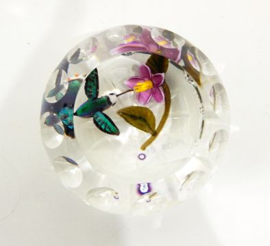 Two glass paperweights by John Deacons, each of circular form with faceted panels, the centre lampwork depicting iridescent hummingbirds feeding from flowers, with JD signature canes, approx. 7.5cm diameter (2)
