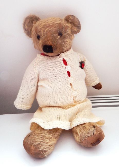 Vintage Merrythought mohair bear with glass eyes wearing a knitted skirt and cardigan, brooch of red glass pinned (very worn)