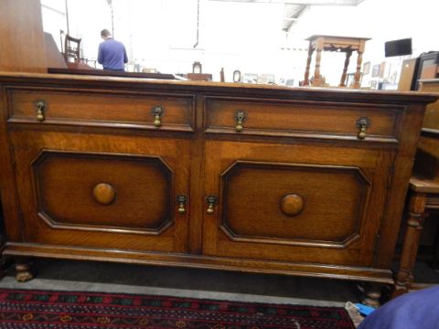 Oak side cupboard with two frieze drawers, pair panel doors below enclosing shelf, on turned feet, width 137cm