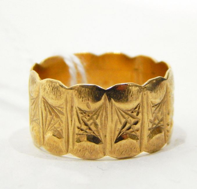 9ct gold ring with cross cut engraved decoration together with two ear studs