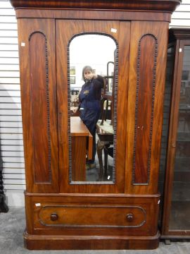 Victorian mahogany wardrobe, the mirror door enclosing hanging space, with a long drawer below, raised on a plinth base, width 114cm