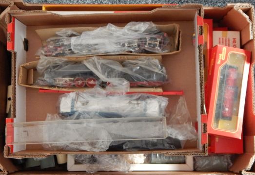 Jouef SNCF locomotive and tender, two more locomotives and tenders, Triang Hornby models, assorted passenger coaches, etc.