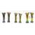Two pairs of green tall ribbed carnival glass vases with flared rims, both 28cm high approx., a blue carnival glass vase and one other (6)