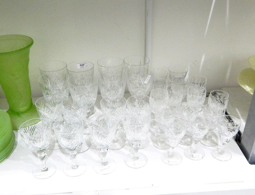 Suite of table glass comprising six large wine glasses and six small wine glasses, all with cut decoration and two further sets of sherry glasses and other items (26)