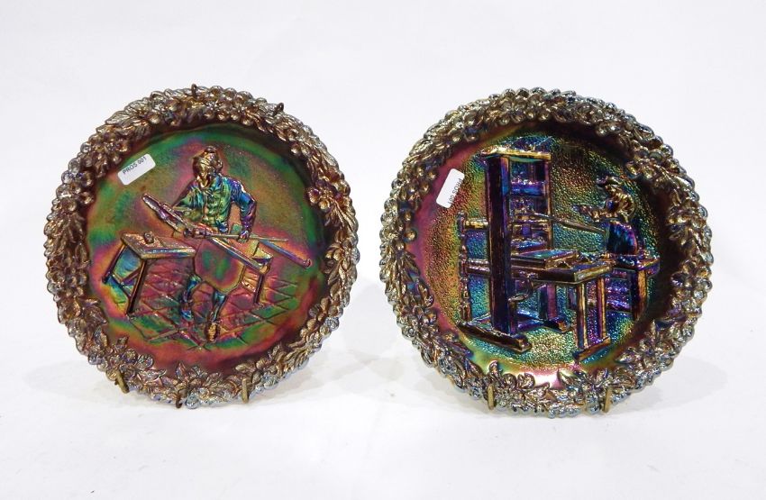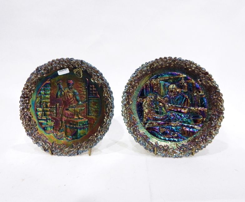 Large blue carnival glass bowl by Fenton, in the 'Stag and Holly' pattern, 28cm diameter, two smaller bowls in the same pattern (one amethyst and one green), another bowl and a set of four Fenton carnival glass plates commemorating early settler craftsmen (8)