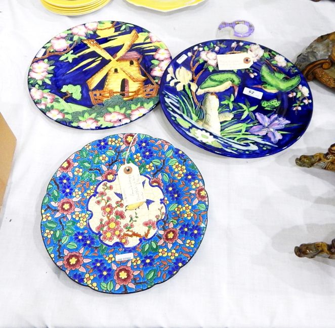 Maling ware plate in underglaze blue, slip decorated with kingfisher surrounded by irises and blossom, 28cm diameter, another similar plate with windmill, 28cm diameter and a French Emaux de Longwy plate with chinoiserie enamel decoration, 26cm diameter (3)