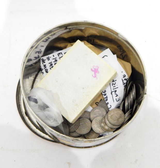 Quantity of mixed coins including a Victorian rupee (1 tin)