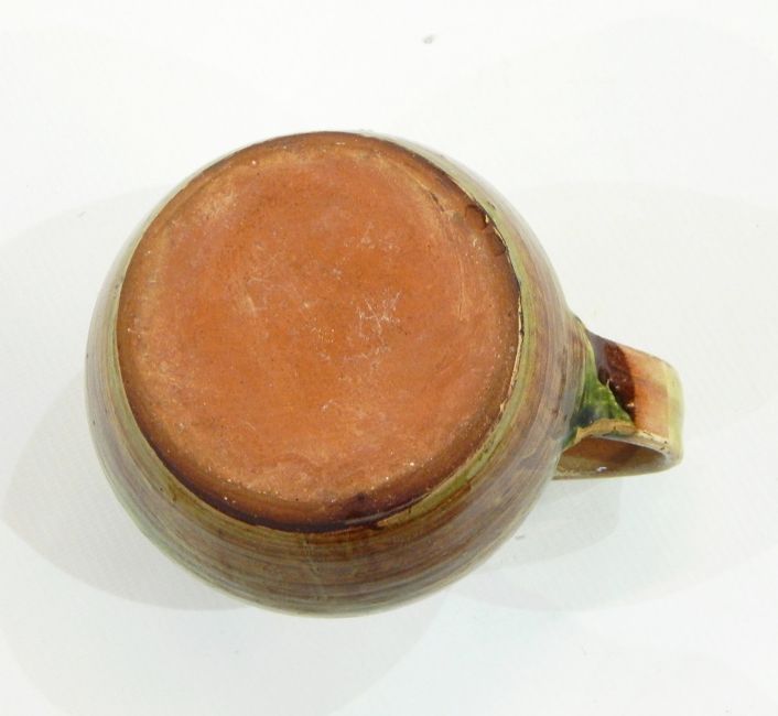 Ray Finch Winchcombe pitcher with earliest Ray Finch personal mark 1938, decorated with brushed slip decoration under green glaze, 10cm high
