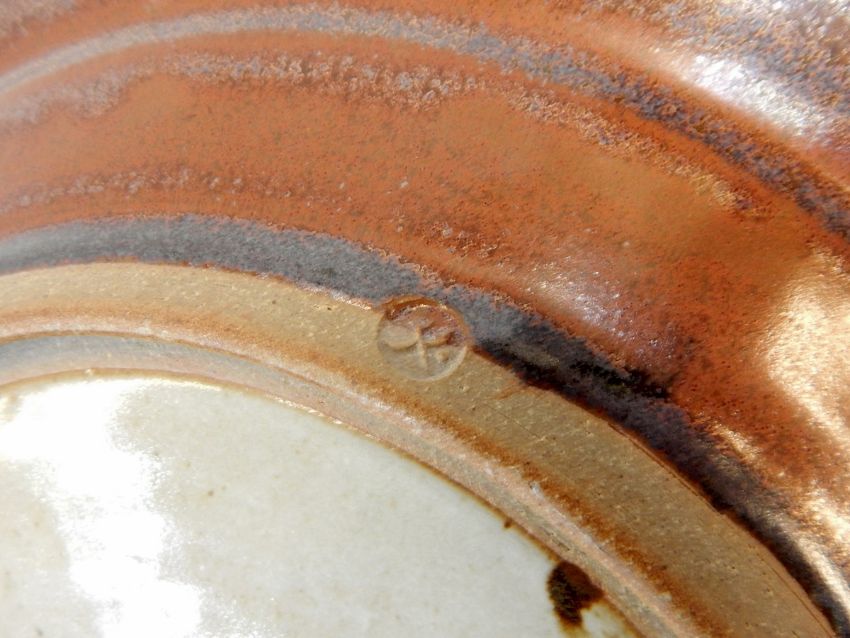 Ray Finch Winchcombe poured-glaze charger with mottled green slip over rust groud, stamped to base, 34cm wide