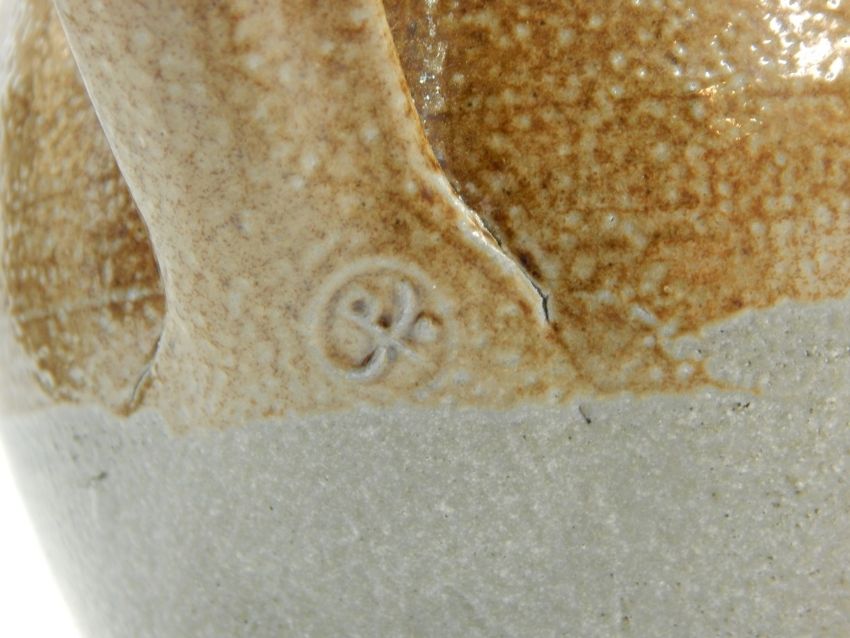 Ray Finch Winchcombe salt glazed jug with brown and grey ground, stamped to handle base, 17cm high