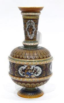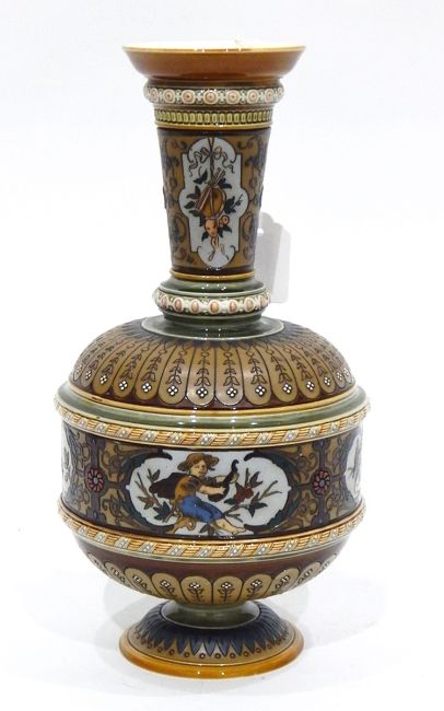 Mettlach stoneware vase of ball and shaft pedestal design, incised and raised decoration, depicting cartouches of trophies and boys playing instruments, 32cm high