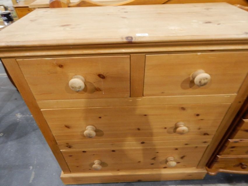 Pine chest, of two short and two long drawers with turned handles and on plinth base 98cm wide