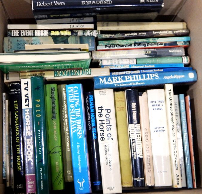 Large quantity of books relating to horses, horse management, polo, Riding magazine in bound folders including:-Vavra, Robert"Equus Reined", William Morrow & Company 1987, black cloth, gilt titles and dust jacketTrew, Cecil G"The Accoutrements of the Riding Horse", Seeley Service & Co, brown cloth, dust jacket (3 boxes)