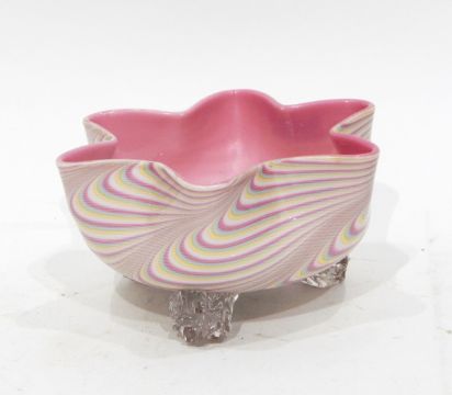 Stevens & Williams 'Osiris' pattern bowl with serrated rim, pink interior and pink, green and yellow striped exterior, raised on three clear crinkled ball feet, 19cm diameter