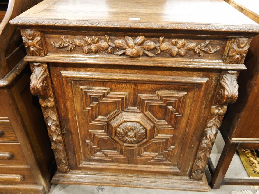 Victorian carved oak side cupboard, the frieze drawer with foliate carving, with cupboard below enclosing shelf, flanked by foliate scrollwork capitals, width 89cm