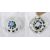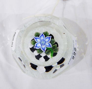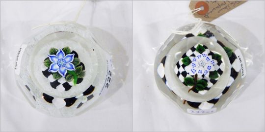 Glass paperweight by John Deacons of circular form, with faceted viewing window containing lampwork blue-petalled flower on a black and white chequer base, JD signature cane and date 2007 to base, 8.5cm diameter and a similar John Deacons paperweight enclosing blue and white lampwork flower and having JD signature cane to base, 8.5cm diameter (2)
