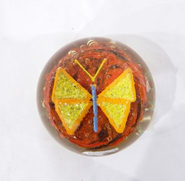 Glass paperweight, of circular form with central butterfly decoration, another purple glass paperweight, with central plaque inscribed 'Home Sweet Home from Dave to Mother', and a third glass paperweight, with a yellow and blue flower on scrambled latticinio canes (3)