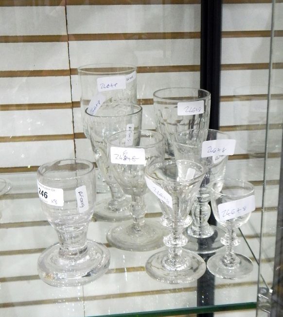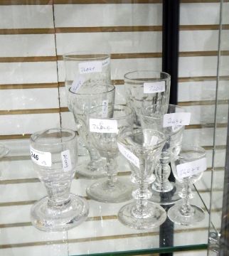 Late 18th/early 19th century firing glass of squat proportions, 11cm high, a 19th century thumb-cut rummer and six other glasses (8)