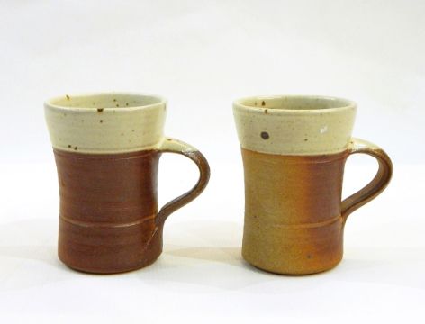 Ray Finch Winchcombe wood fired coffee pot and four mugs with cream slip to rims, stamped (5)