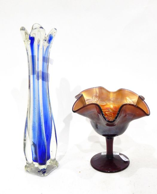 Pair of red glass vases of baluster form, with applied rose decoration, an amethyst carnival glass pedestal bowl decorated with strawberries and one other item (4)