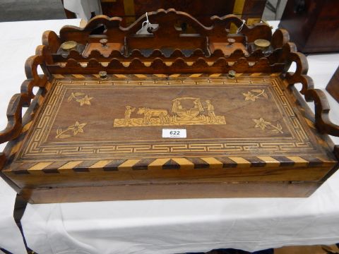 19th century walnut table-top writing slope, possibly Italian, with pierced three-quarter gallery fitted with divisions and glass inkwells, the cover of the hinged slope inlaid with a scene of travellers in a covered carriage suspended on sleighs pulled by oxen 47cm wide