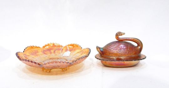 Fenton marigold carnival glass bowl decorated in the peacock and grape pattern, a bowl decorated with roses, a shallow dish decorated with daisies, a swan butter dish and cover and various other items of marigold carnival glass (13)