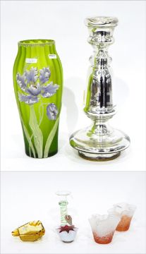 Victorian large silvered mercury glass candlestick of knopped design, 34cm high (cracked), a green glass vase decorated in relief with a purple poppy, 28cm high, an Edward VII commemorative amber glass ashtray and four other items (7)