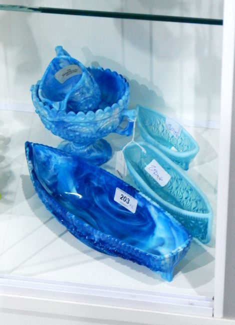 Victorian blue marbled pressed glass model of a boat, two blue vaseline glass models of boats, a blue vaseline model of a lady's shoe and a marbled blue pressed glass two-handled sugar bowl and cream jug by George Davidson, decorated with scallopshells and seaweed, bearing a label for the 'Raymond Slack Collection' (6)