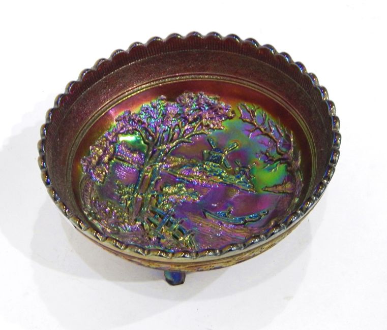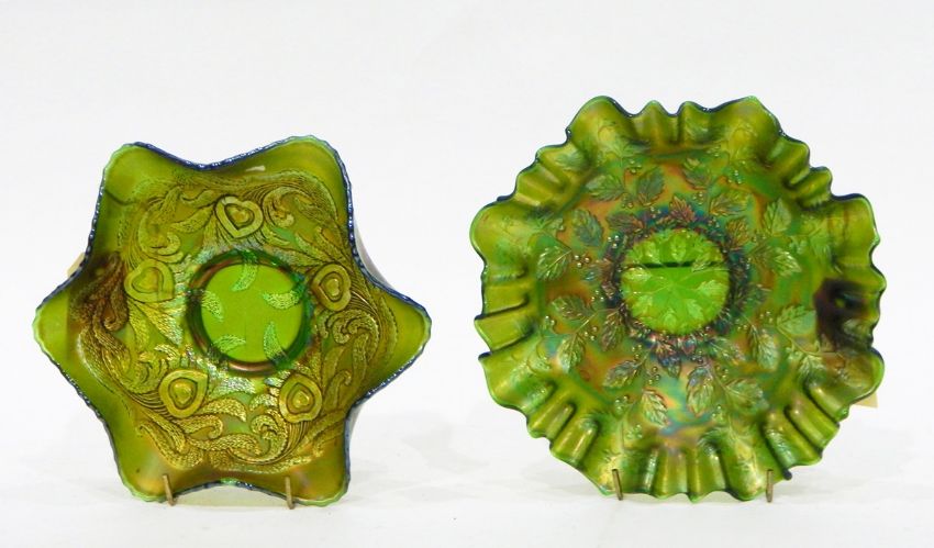 Fenton amethyst carnival glass dish in the 'Chrysanthemum' pattern, a green carnival glass bowl by Fenton in the 'Hearts and Vine' pattern, two carnival glass bowls decorated with a windmill theme, an amethyst carnival glass bowl with a central Star of David and five others (10)