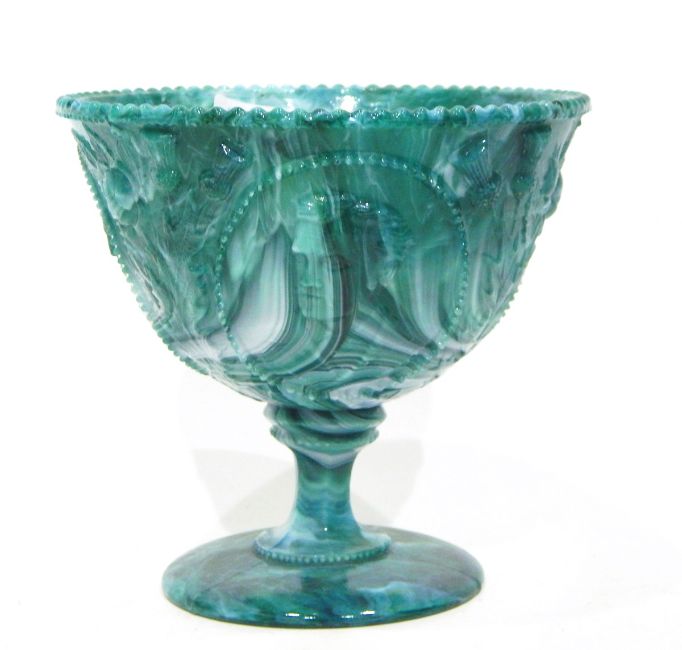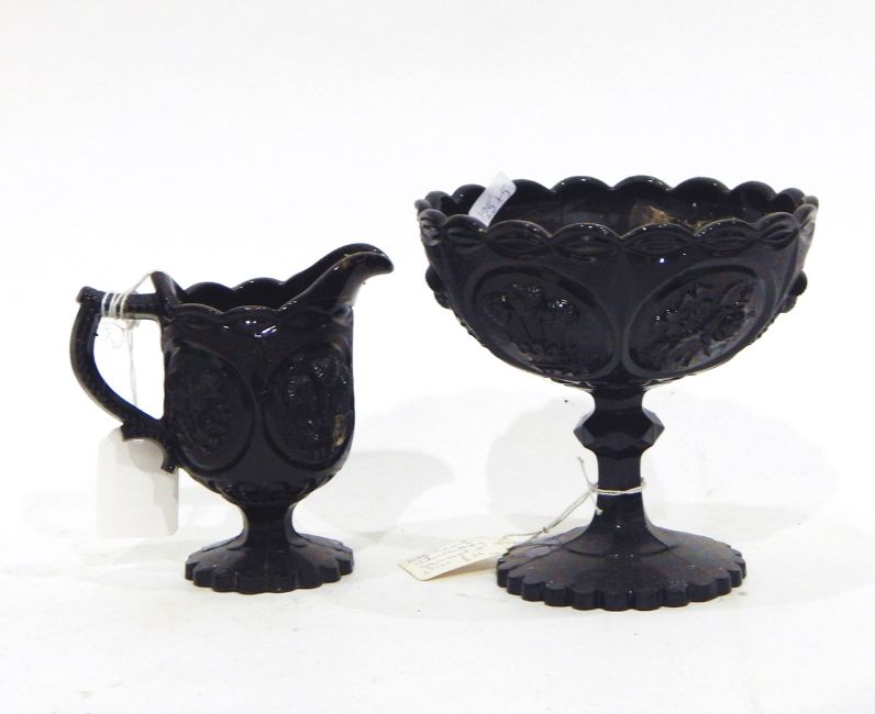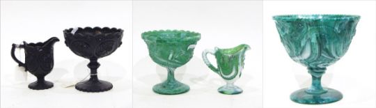 Victorian marbled green pressed glass cream jug and pedestal sugar bowl set by Henry Greener & Co, each moulded with union flowers, roses, thistles and clover, a green marbled pressed glass pedestal bowl by Henry Greener & Co moulded with portraits and inscribed 'Marquis & Marchioness of Lorne, landed in Halifax NS, 25 Novr 1878', and a black pressed glass jug and bowl set moulded with Union flowers and the Prince of Wales feathers (5)