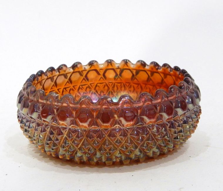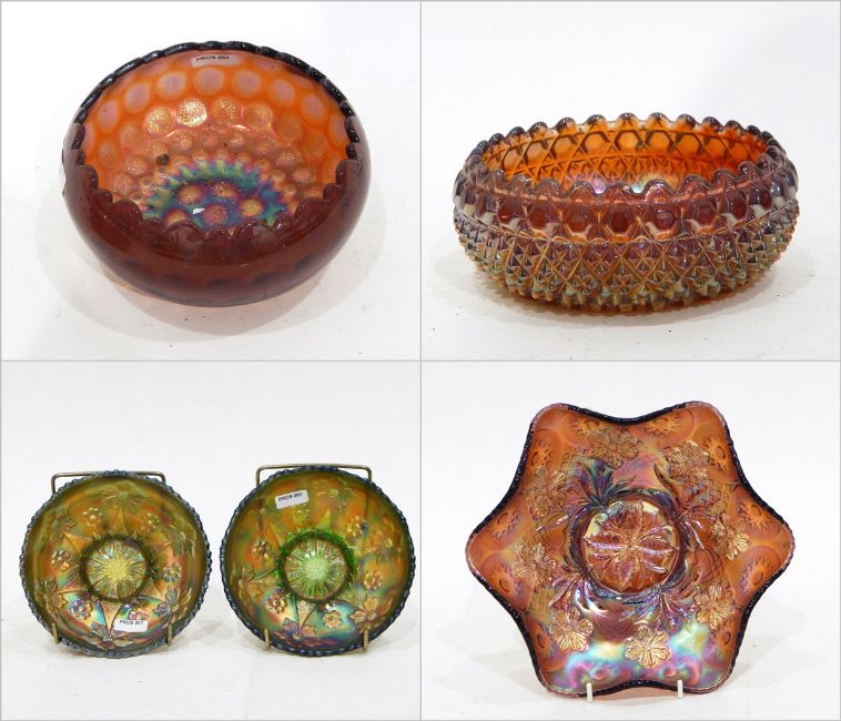 Amethyst carnival glass bowl by Millersburg in the 'Primrose' pattern, a Fenton amethyst carnival glass bowl in the 'Feathered Serpent' pattern and six other items (8)