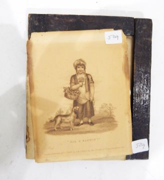 Continental head and shoulders over-painted print of a young girl, her headdress trimmed with roses, a crucifix and scarf around her neck, framed with an engraving 'All a blowin' ' in damaged frame
