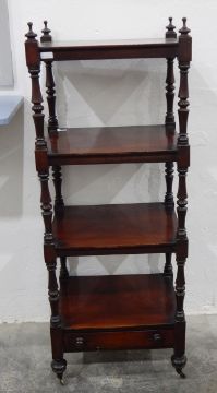 Early 19th century mahogany four-tier whatnot fitted a drawer to base, having turned supports and on four brass castors