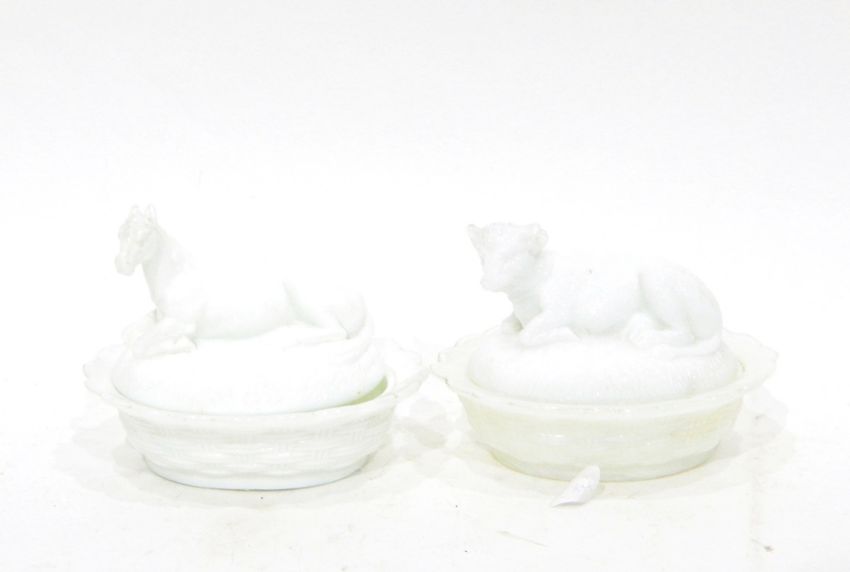 Four white pressed glass butter dishes and covers with animal covers, comprising a cow, a horse, a duck and a chicken, a Victorian white pressed glass butter dish and cover modelled as shells, possibly by George Davidson and a white pressed glass dessert plate by Henry Greener (6)
