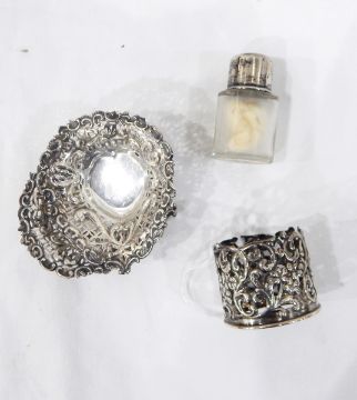 Pair of late Victorian silver bonbon dishes with open fretwork borders, Birmingham 1899 together with a green glass scent bottle with foliate silver mounts, London 1898 and a further silver-capped scent bottle (4)