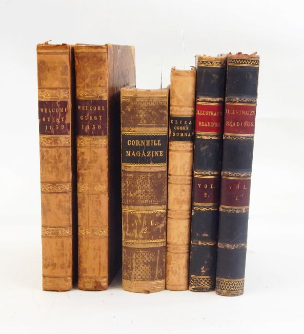 The Rev J G Wood"The Illustrated Natural History", Vol. 1 Mammalia, Vol. 2 Birds, Vol. 3 Reptiles, Fishes Molluscs etc, Routledge, Warne, London, Vol. 1 front board and back strip detached, half leather, Ills. throughout, marbled boards, gilt titles on pastedowns to backstrip, with the "Book of Days", 2 vols. 1864 and 1863, marbled boards, half leather, gilt titles, with "Welcome Guest", 6 vols, all marbled boards, half leather but rather rubbed, 1 vol. of the Cornhill Magazine 1860, marbled boards, half leather, gilt titles, "Eliza Cook's Journal" 1852, half leather, marbled boards and two volumes Cassell's "Penny Readings", marbled boards, half leather, gilt paystands a bit bumped and rubbed (16)