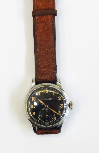 Jaeger-Lecoultre gent's wristwatch the black face with luminous hands and numerals, subsidiary seconds dial, the back numbered 259949