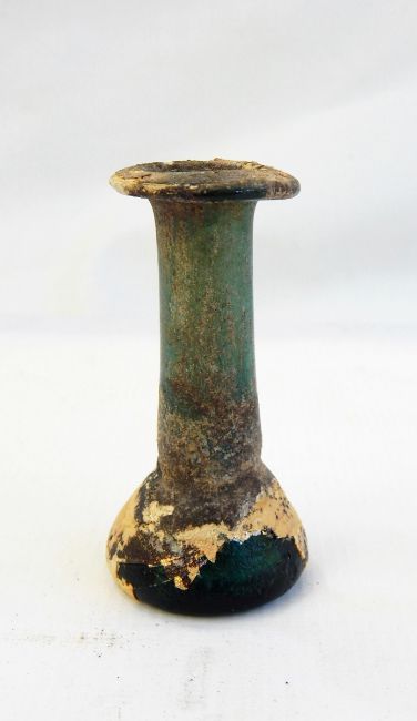 Ancient green glass vessel with long cylindrical neck and flared rim, 7.5cm high