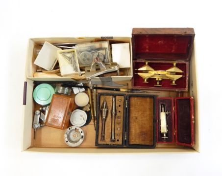 Brass depthing tool, cased and numbered '97' to the lid, three boxes of small watchmaker's tools, cased and sundry other tools