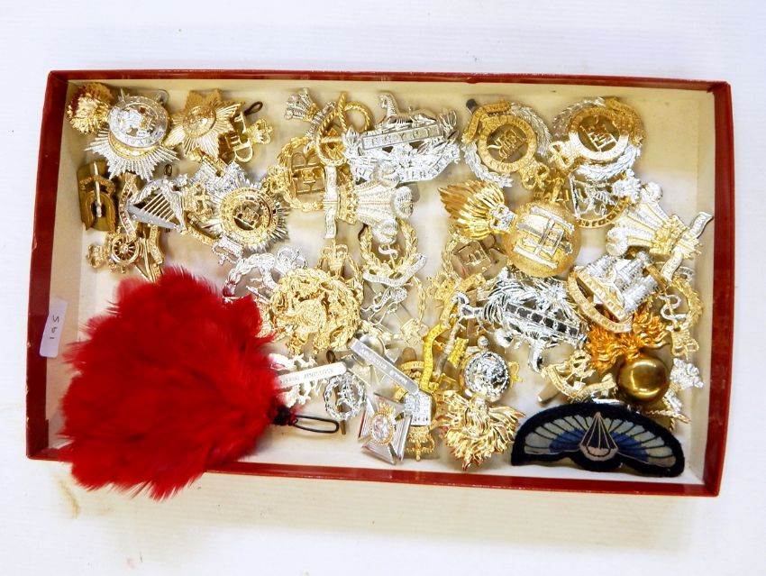 Assorted replica cap badges, a Dinky Toys diecast model of a Viscount Air France plane and an "In Defence of Singapore" series of drawings