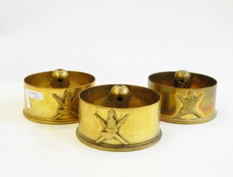 Group of three WWI medals comprising the 1914-15 Star, the War medal and the Victory medal, awarded to Cpl J F Bayley RE37866 and various other items including cap badges, miniatures, three Omani medals accompanied by three artillery shell bases reputedly used by the Omani Army, bearing the Oman emblem