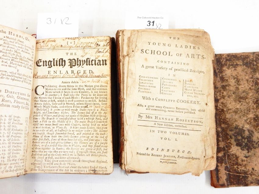 Robertson, Mrs Hannah "The Young Ladies School of Arts. containing a great variety of practical receipts... with a complete cookery. Also a great many curious receipts, both useful and entertaining, never before published", a new edition corrected, two vols bound as one, Edinburgh, Robert Jameson 1777, first pages loose, ffep missing, contemporary writing on the blank leaf, contemporary boards, front and back board detached, backstrip very worn but still present (just), final page is 171 of second volumeCulpepper, Nich "The English Physician Enlarged... medicines made of English herbs...", London, S Ballard, etc. 1741, many contemporary annotations on most pages, the binding has split pages 182 and 183, contemporary full leather (2)