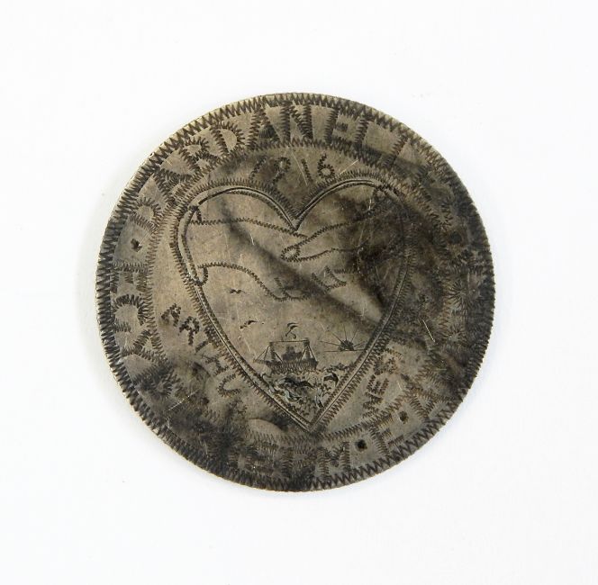 WWI Trench Art coin, one side engraved with clasped hands above an ocean scene within a heart and inscribed 'Arthur Westerman 1916' and around the edge 'Dardanelle, Egypt, Germ E Africa', engraved on the reverse of a German East Africa silver coin