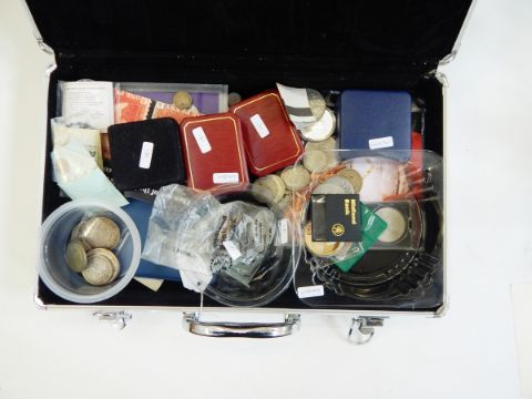 1937 crown, 1893 crown, 1889 double Florin plus other silver and pre-47 silver and a 1978 proof set, 2012 set, 1797 cartwheel tuppence, two silver Concord crown coins, 1886 third of a farthing, etc.