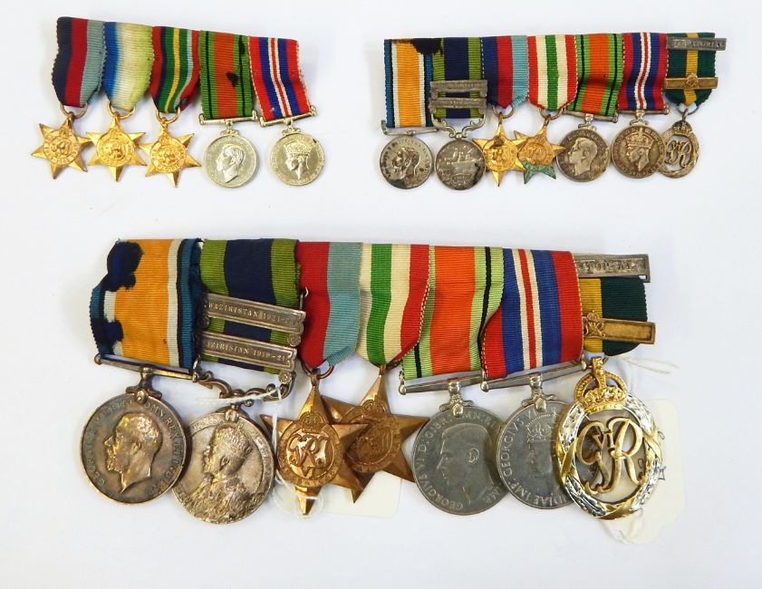 Group of seven medals comprising the 1914-18 War medal awarded to 2nd Lt O F Curtoys, the George V India General Service medal with two bars (Waziristan 1919-21 and 1921-24) awarded to Lt O F Curtoys, Sikh PNRS, a 1939-45 Star, the Italy Star, a 1939-45 Defence medal, a 1939-45 War medal and a George VI Efficiency medal with gilt bar and with Territorial bar, a corresponding set of miniatures, a second set of miniatures for a WWII medal group and various other items