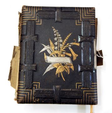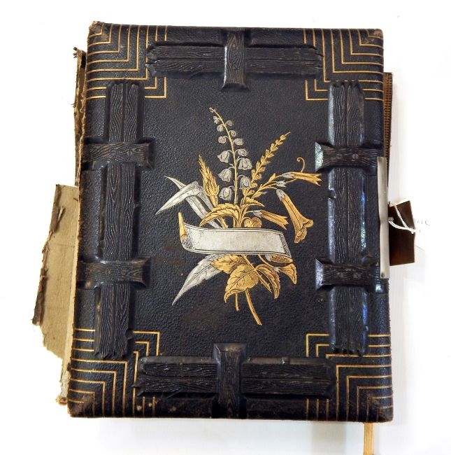 Victorian embossed leather musical photograph album and contents of portrait photographs, with music box mechanism to the back