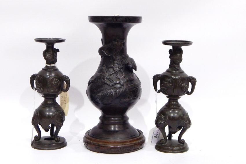Japanese bronze baluster vase, footed and embossed with quail, on flowering branches, 24cm high and the carved hardwood stand and a pair of Japanese bronze double-gourd two-handled vases, each on tripod scroll supports and circular foot and having elephant's head handles, 21cm high (3)