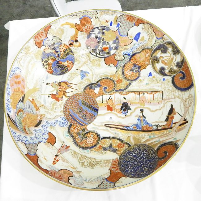 Massive Japanese Imari porcelain charger, circular and decorated in typical colours with figures on horseback in landscape, in a punt beside garden pergola and having roundels of scrolls, peonies and lobster, six-character mark in underglaze blue to base, 66cm diameter (40cm crack running from edge around base)