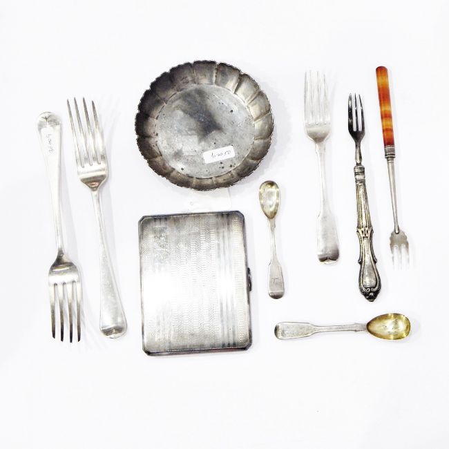 Silver circular dish by Daniel & John Wellby, London 1906, of shallow circular fluted form, 11cm diameter, a silver cup, Birmingham 1913, a pair of George III silver table forks, another silver dessert fork, two silver condiment spoons, two pickle forks (one with agate handle) and an EPNS cigarette case, 13oz weighable silver