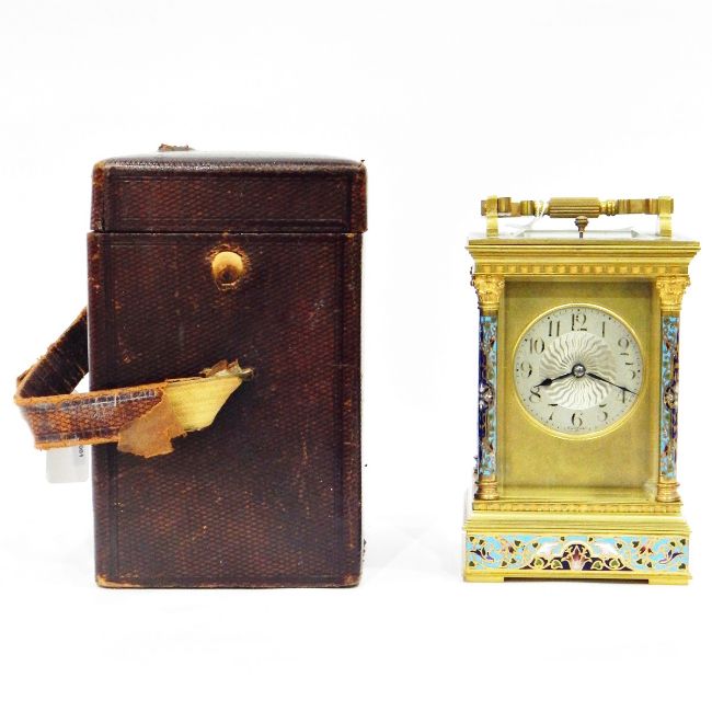 Fine French Richard & Co carriage clock with champleve enamel floral panels, silvered dial, repeat striking movement, marked R & Co in oval, height 20cm over the handle, with leather travelling case
